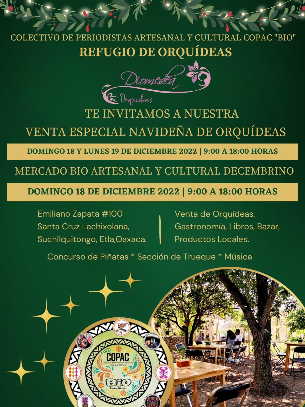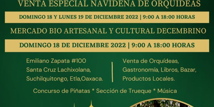 Oaxaca, México; 7 Diciembre 2022.- El Colectivo de Periodistas Artesanal y Cultural (COPAC) “BIO” y el Refugio de Orquídeas “Orquídeas Diomedea” preparan venta especial de ‘Orquídeas’ y Mercado BIO Artesanal y Cultural Decembrino los días domingo 18 y lunes 19 de diciembre en Santa Cruz Lachixolana, Suchilquitongo, Etla ubicado a unos 45 minutos del centro de la ciudad de Oaxaca.