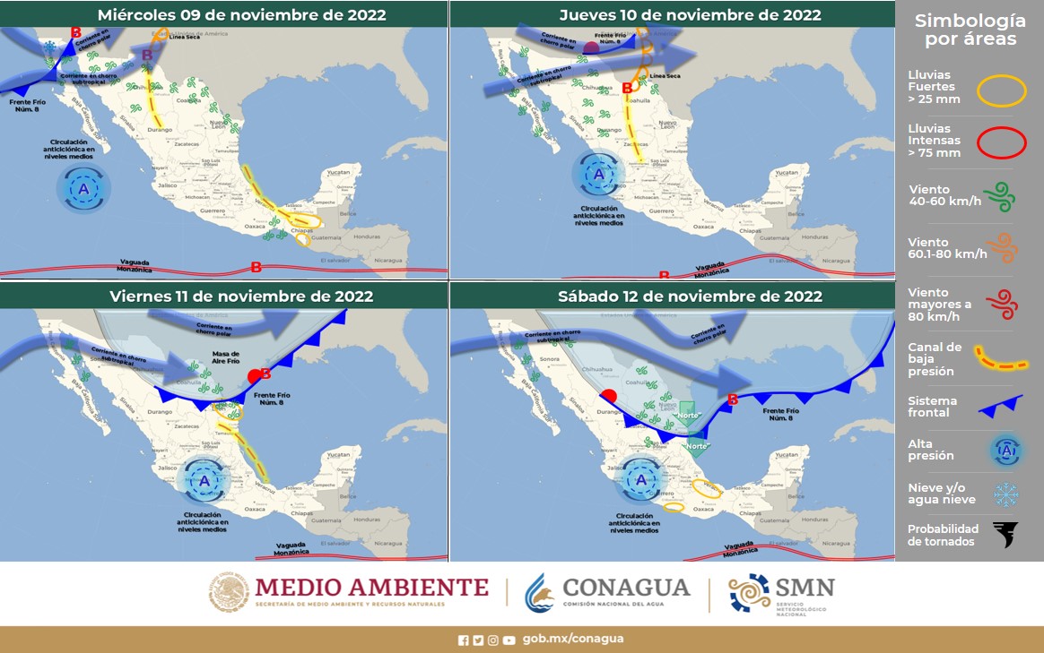 Para hoy, el frente frío Núm. 8 se desplazará sobre Baja California, Sonora y Chihuahua, en interacción con una vaguada polar y con las corrientes en chorro subtropical y polar, lo que ocasionará rachas de viento fuertes a muy fuertes y descenso de temperatura en el noroeste de México, además de lluvias con chubascos y probabilidad para la caída de aguanieve o nieve durante esta mañana en sierras de Baja California. Por otra parte, un canal de baja presión sobre el occidente del Golfo de México y el sureste del país, además del ingreso de humedad del Océano Pacífico, Golfo de México y Mar Caribe producirán lluvias puntuales fuertes en Chiapas, y lluvias con chubascos en Sonora y entidades del oriente, sur y sureste de México, así como en la Península de Yucatán; todas con posibles descargas eléctricas. Finalmente, una circulación anticiclónica en niveles medios de la atmósfera, mantendrá escasa probabilidad de lluvias y ambiente vespertino cálido a caluroso, sobre entidades del norte, noreste, occidente y centro de la República Mexicana.
