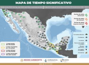 Pacífico Sur: Cielo nublado durante el día con probabilidad de lluvias aisladas en zonas de Chiapas y Oaxaca en las primeras horas de esta mañana. Aumento de nubosidad por la tarde con probabilidad de lluvias puntuales fuertes en Chiapas y lluvias con chubascos en Oaxaca y Guerrero; todas acompañadas de descargas eléctricas. Ambiente matutino fresco y con bancos de niebla en zonas serranas de Chiapas, frío en sierras de Oaxaca y templado sobre zonas costeras. Por la tarde, ambiente cálido, siendo caluroso en zonas de Guerrero y Oaxaca. Viento de dirección variable de 15 a 30 km/h en la región, con rachas de componente norte, de 60 a 70 km/h, en el Istmo y Golfo de Tehuantepec.
