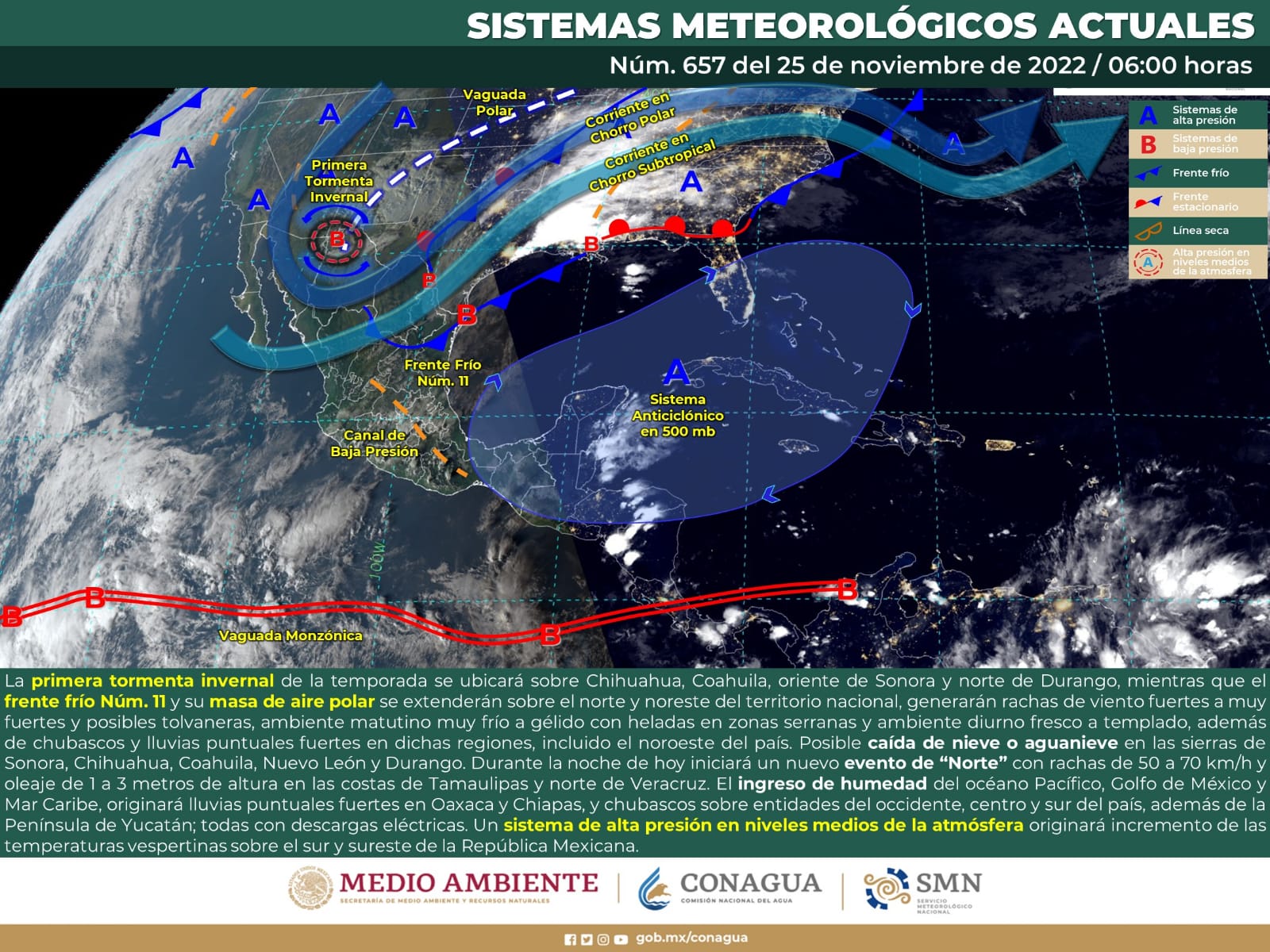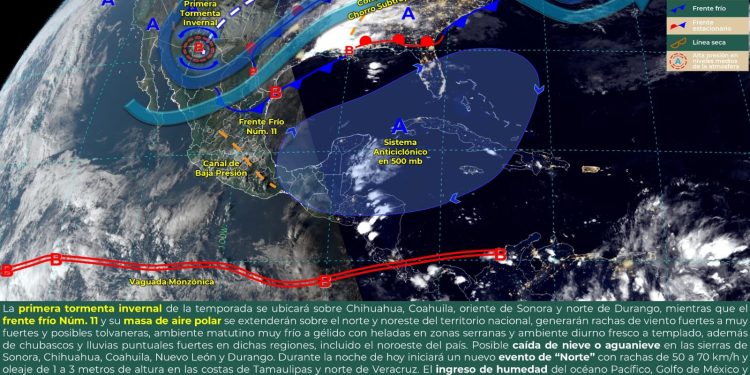Para hoy, la primera tormenta invernal de la temporada se ubicará sobre Chihuahua, Coahuila, oriente de Sonora y norte de Durango, mientras que el frente frío Núm. 11 y su masa de aire polar se extenderán sobre el norte y noreste del territorio nacional, lo que generará rachas de viento fuertes a muy fuertes y posibles tolvaneras, ambiente matutino muy frío a gélido con heladas en zonas serranas y ambiente diurno fresco a templado, además de chubascos y lluvias puntuales fuertes en dichas regiones, incluido el noroeste del país. Por otro lado, el ingreso de humedad del océano Pacífico, Golfo de México y Mar Caribe, originará lluvias puntuales fuertes en Oaxaca y Chiapas, y chubascos sobre entidades del occidente, centro y sur del país, además de la Península de Yucatán; todas con descargas eléctricas.