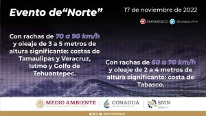 Evento de “Norte” con rachas de 70 a 90 km/h y oleaje de 3 a 5 metros de altura significante: costas de Tamaulipas, Veracruz, Istmo y Golfo de Tehuantepec.
