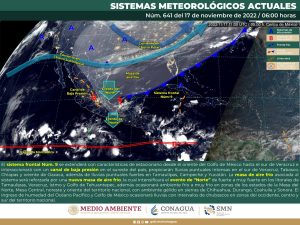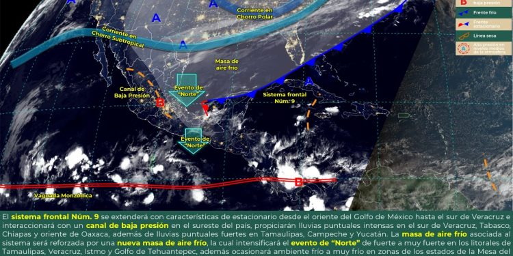 Para hoy, el sistema frontal Núm. 9 se extenderá con características de estacionario desde el oriente del Golfo de México hasta el sur de Veracruz e interaccionará con un canal de baja presión en el sureste del país, propiciarán lluvias puntuales intensas en el sur de Veracruz, Tabasco, Chiapas y oriente de Oaxaca, además de lluvias puntuales fuertes en Tamaulipas, Campeche y Yucatán. La masa de aire frío asociada al sistema será reforzada por una nueva masa de aire frío, la cual intensificará el evento de “Norte” de fuerte a muy fuerte en los litorales de Tamaulipas, Veracruz, Istmo y Golfo de Tehuantepec, además ocasionará ambiente frío a muy frío en zonas de los estados de la Mesa del Norte, Mesa Central, noreste y oriente del territorio nacional, con ambiente gélido en sierras de Chihuahua, Durango, Coahuila y Sonora. Finalmente, el ingreso de humedad del Océano Pacífico y Golfo de México ocasionará lluvias con intervalos de chubascos en zonas del occidente, centro y sur del territorio nacional.