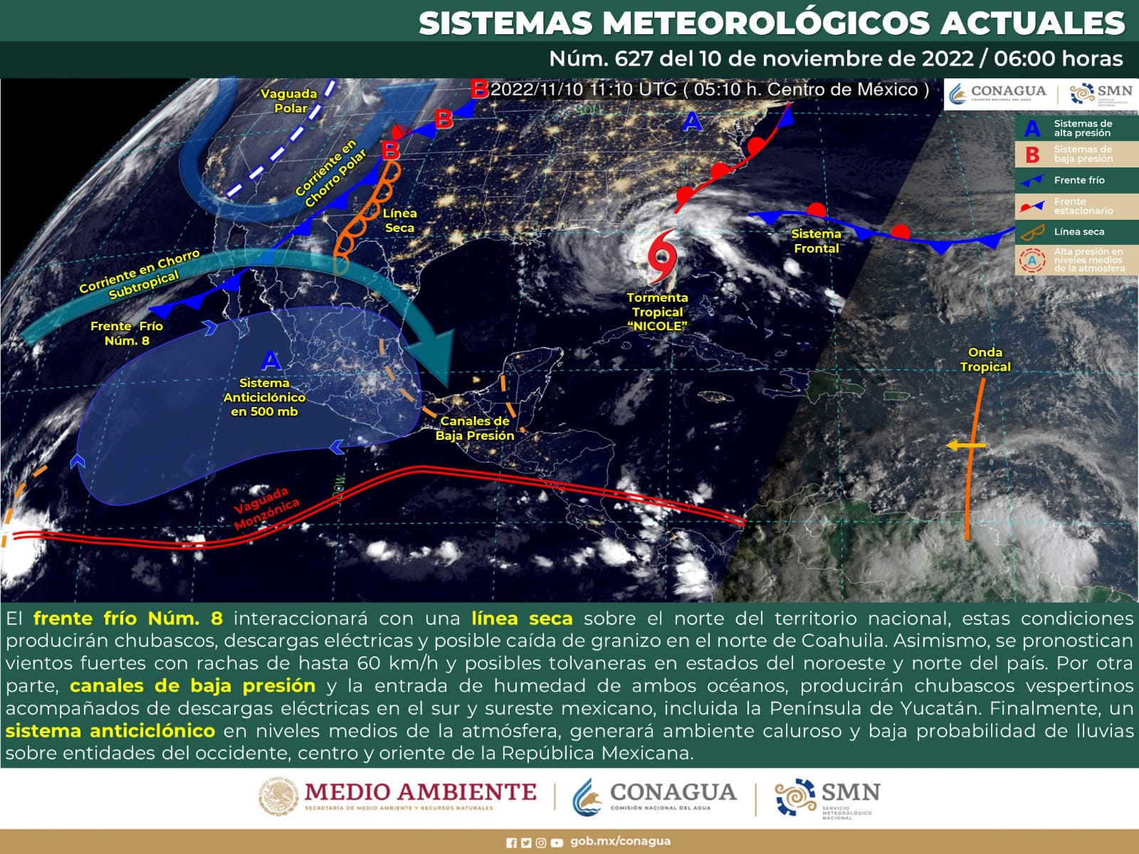 Este día, el frente frío Núm. 8 interaccionará con una línea seca sobre el norte del territorio nacional, estas condiciones producirán chubascos, descargas eléctricas y posible caída de granizo en el norte de Coahuila. Asimismo, se pronostican vientos fuertes con rachas de hasta 60 km/h y posibles tolvaneras en estados del noroeste y norte del país. Por otra parte, canales de baja presión y la entrada de humedad de ambos océanos, producirán chubascos vespertinos acompañados de descargas eléctricas en el sur y sureste mexicano, incluida la Península de Yucatán. Finalmente, un sistema anticiclónico en niveles medios de la atmósfera, generará ambiente caluroso y baja probabilidad de lluvias sobre entidades del occidente, centro y oriente de la República Mexicana.