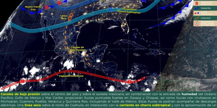 Para hoy, canales de baja presión sobre el centro del país y sobre el sureste mexicano, en combinación con la entrada de humedad del Océano Pacífico, Golfo de México y Mar Caribe, propiciarán lluvias puntuales fuertes (25 a 50 mm) en Oaxaca y Chiapas, así como lluvias con chubascos en Michoacán, Guerrero, Puebla, Veracruz y Quintana Roo, incluyendo el Valle de México. Estas lluvias se podrían acompañar de descargas eléctricas. Por otra parte, una línea seca sobre el norte de Coahuila, en interacción con la corriente en chorro subtropical y con la aproximación de un nuevo frente frío al norte del territorio nacional esta noche, originarán rachas de viento fuertes a muy fuertes en el noroeste, norte y noreste de México.