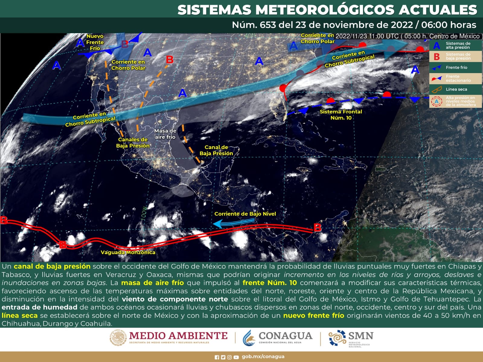 Para hoy, un canal de baja presión sobre el occidente del Golfo de México mantendrá la probabilidad de lluvias puntuales muy fuertes en Chiapas y Tabasco, fuertes (25 a 50 mm) en Veracruz y Oaxaca, mismas que podrían originar incremento en los niveles de ríos y arroyos, deslaves e inundaciones en zonas bajas. Por su parte, la masa de aire frío que impulsó al frente Núm. 10 comenzará a modificar sus características térmicas, favoreciendo un ascenso de las temperaturas máximas sobre entidades del norte, noreste, oriente y centro de la República Mexicana, así como la disminución en la intensidad del viento de componente norte sobre el litoral del Golfo de México, Istmo y Golfo de Tehuantepec. Además, la entrada de humedad de ambos océanos ocasionará lluvias y chubascos dispersos en zonas del norte, occidente, centro y sur del país.