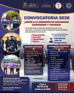 Con el firme compromiso de fortalecer la tranquilidad y el bienestar de nuestras familias, el Ayuntamiento de Santa Cruz Xoxocotlán invita a la ciudadanía a consultar la Convocatoria 2026 para integrarse a la Comisión de Seguridad Ciudadana y Vialidad.