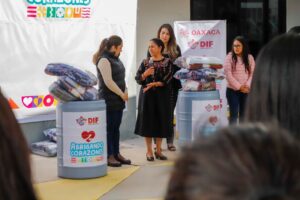 - La presidenta honoraria del DIF estatal encabeza la instalación de los centros de acopio en las oficinas de la Secretaría de Salud y la UABJO; y recibe una donación de cobijas