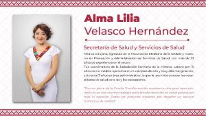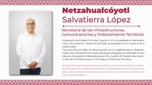 En la Secretaría y Servicios de Salud estará al frente Alma Lilia Velasco Hernández; en la nueva Secretaría de Infraestructuras, Comunicaciones y Ordenamiento Territorial, Nezahualcóyotl Salvatierra López; en la Secretaría de Movilidad, Claudina de Gyves Mendoza.
