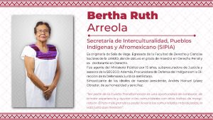 En la Secretaría de Interculturalidad, Pueblos Indígenas y Afromexicano, Bertha Ruth Arreola Ruiz.