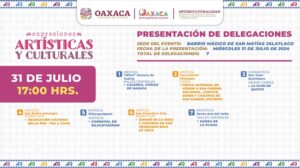 El 7 de julio será en la Alameda de León y se presentarán: Trinidad de las Huertas; Santa Catarina Cuixtla; Matías Romero Avendaño; San Pedro Ixtlahuaca; Santa Ana Zegache y Asunción Nochixtlán.