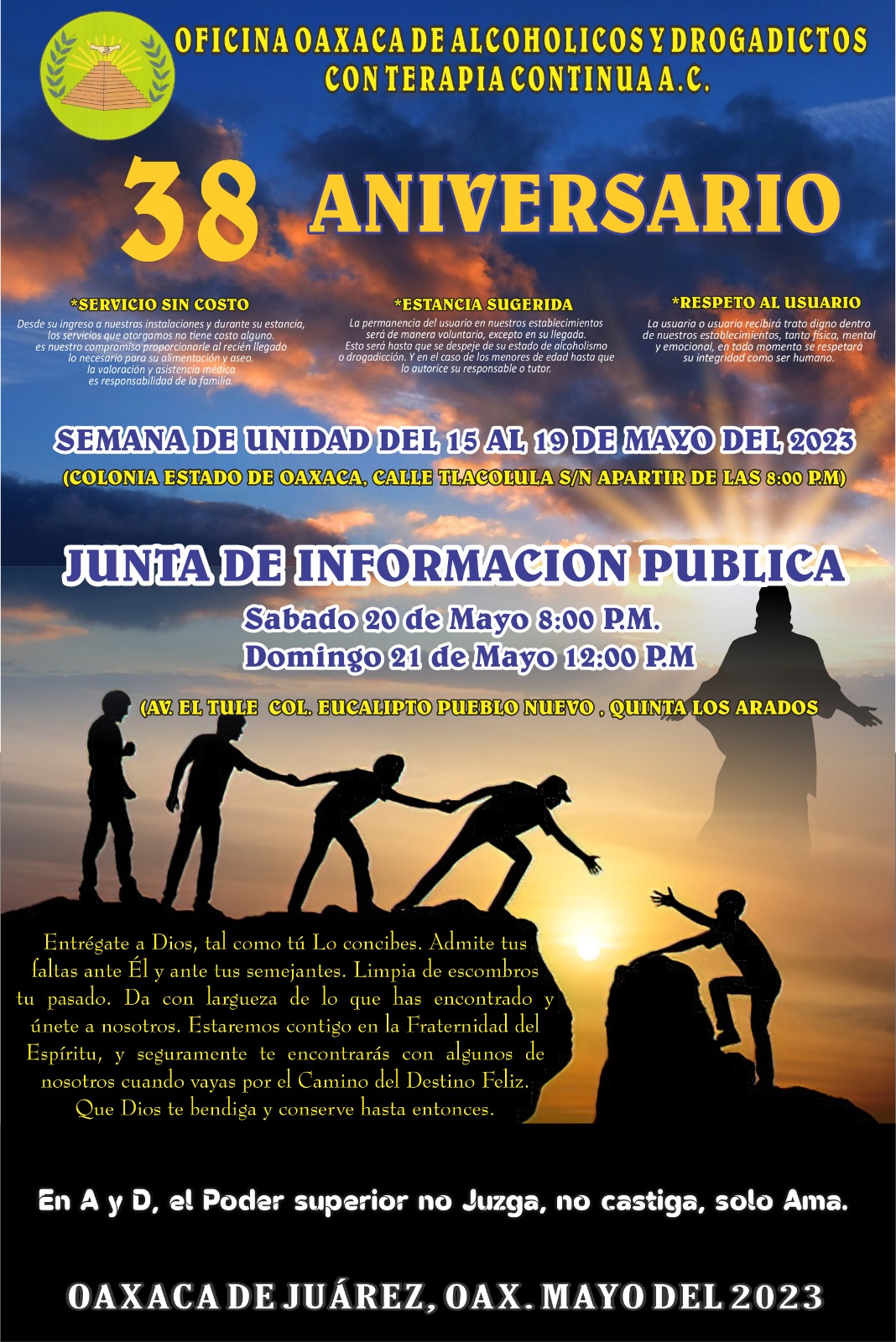 La Oficina Oaxaca de Grupos de Alcohólicos y Drogadictos con Terapia Continua A.C. da a conocer a la sociedad oaxaqueña que nuestro movimiento está cumpliendo 38 años ayudando Al enfermo a recuperarse del alcoholismo y la drogadiccción.