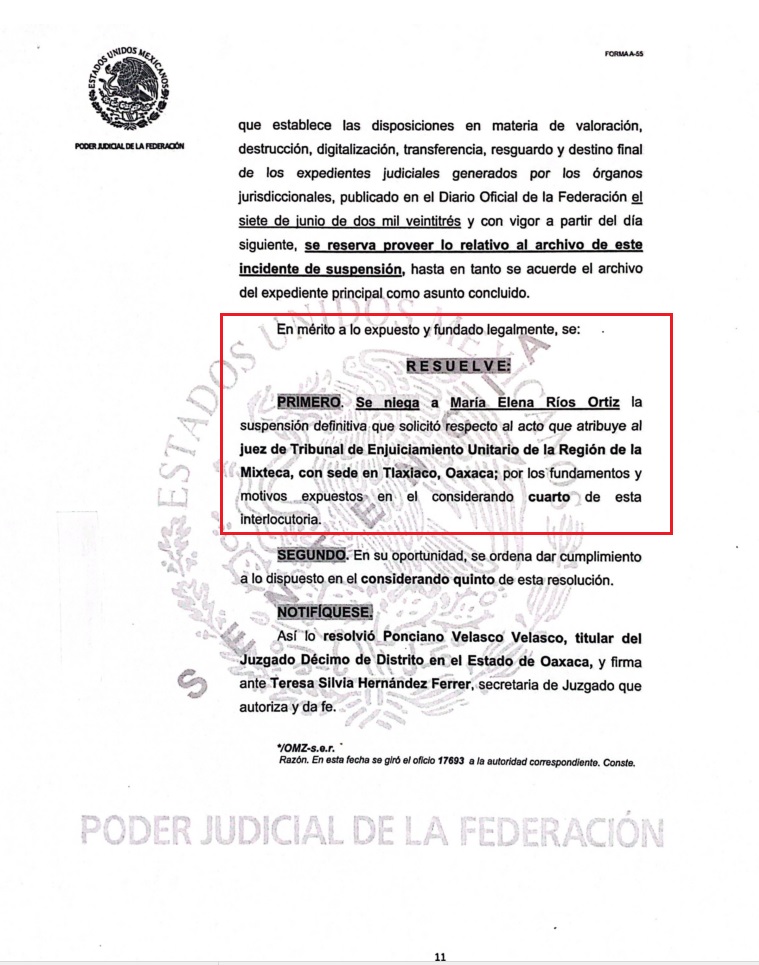 En la resolución se destaca lo siguiente: “Que, de concedérsele el amparo, se atentaría contra los principios de concentración y de continuidad, que rigen el sistema de justicia penal y por lo tanto, se niega la suspensión definitiva solicitada por María Elena Ríos Ortiz”.