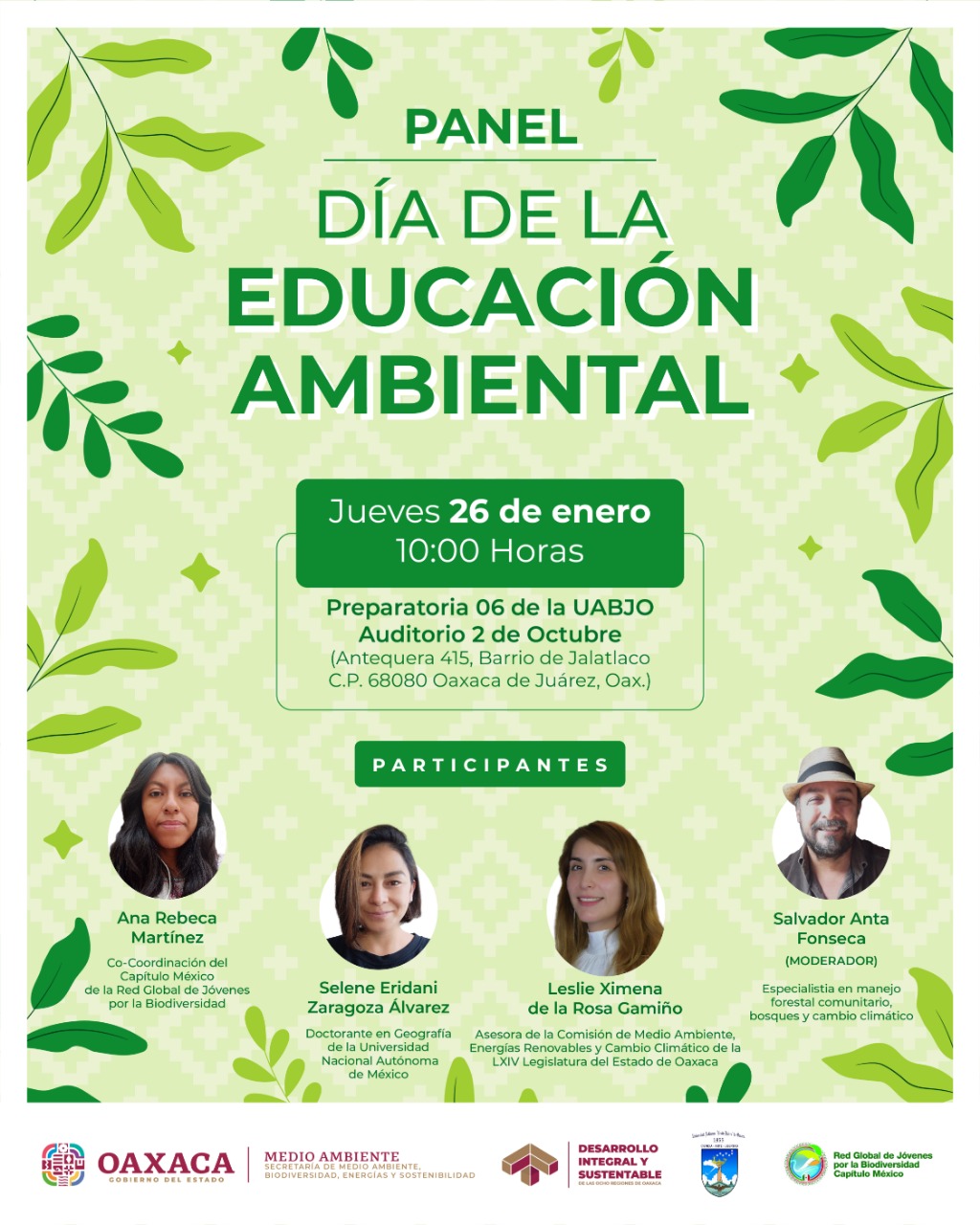 Este diálogo, que tendrá como sede la Escuela Preparatoria Número 6 de la UABJO, a las 10:00 horas, contará con la presencia de Ana Rebeca Martínez, integrante de la Coordinación del capítulo México de la Red Global de Jóvenes por la Biodiversidad (GYBN); así como de Selene Eridani Zaragoza Álvarez, doctorante en Geografía por la Universidad Nacional Autónoma de México (UNAM), y Leslie Ximena de la Rosa Gamiño, asesora parlamentaria.