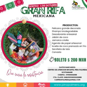 Piña Palmera una asociación civil que acompaña procesos de vida independiente de personas con discapacidad te invita a participar en su Gran Rifa Mexicana a realizarse el 1o. De octubre.