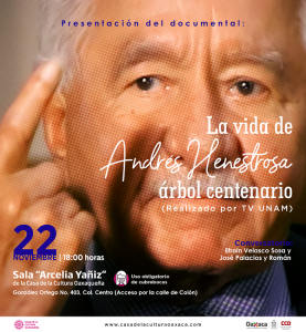 El 22 de noviembre, se proyectará “Andrés Henestrosa. Árbol Centenario”, un documental que muestra una mirada íntima a la vida del oaxaqueño y quien con su obra mantuvo vigente la cultura de Oaxaca; en esta misma actividad el ex director de la CCO, José Palacios y Román y el escritor Efraín Velasco ofrecerán una charla sobre la obra de quien en vida contribuyó a la fonetización de la lengua zapoteca.